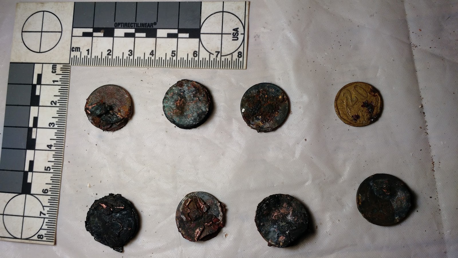 splintering into a multitude of layers. They all appear to have a central point where the metal gave way, exploding out from the surface as the coin expanded. Many have a blue-grey sheen with hints of the original color.